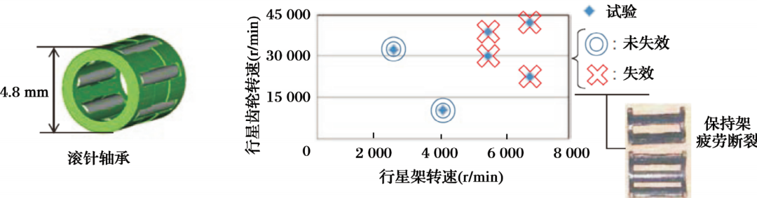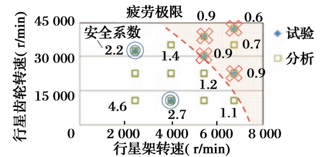 保持架在行星齒輪和行星架的轉(zhuǎn)速下斷裂的試驗(yàn)結(jié)果如圖11所示。行星齒輪耐久性試驗(yàn)證實(shí)在行星齒輪和行星架的高速旋轉(zhuǎn)過(guò)程中,滾針軸承發(fā)生保持架疲勞斷裂。接下來(lái),使用S.S.A.P./MBD,除了采用與行星齒輪耐久性試驗(yàn)相同的條件外,采用條件限制參數(shù)進(jìn)行仿真,并對(duì)保持架的接觸載荷和產(chǎn)生的應(yīng)力進(jìn)行了分析。最終計(jì)算出目標(biāo)保持架相對(duì)于疲勞極限的安全系數(shù),計(jì)算結(jié)果如圖12所示,通過(guò)分析得到的保持架疲勞斷裂趨勢(shì)與實(shí)測(cè)結(jié)果一致。