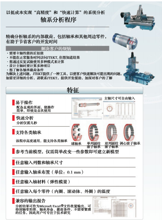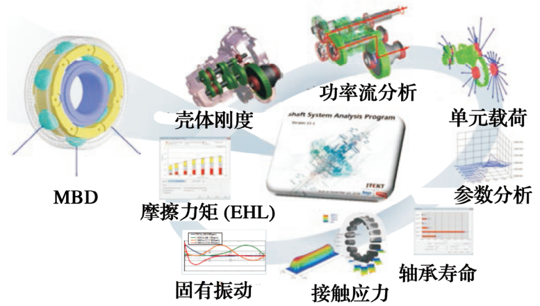 為了應(yīng)對(duì)這種環(huán)境變化,JTEKT獨(dú)立開(kāi)發(fā)了軸系分析程序(S.S.A.P.)作為支持軸承設(shè)計(jì)的軟件。S.S.A.P.的主要功能如圖1所示。S.S.A.P.允許在穿過(guò)多個(gè)軸、齒輪和軸承的單元級(jí)上進(jìn)行建模。同時(shí),通過(guò)考慮功率流、殼體剛度、軸剛度等因素的軸承分析,可研究軸承壽命、內(nèi)部載荷分布、摩擦力矩和其他軸承內(nèi)部載荷狀態(tài)。由于上述背景,人們對(duì)復(fù)雜工況下沖擊造成的損傷和軸承內(nèi)部性能等問(wèn)題更加關(guān)注。使用當(dāng)前的靜力學(xué)分析已無(wú)法了解這些情況,而需要?jiǎng)恿W(xué)分析的情況越來(lái)越多。因此,軸承設(shè)計(jì)中的重要因素是在初始設(shè)計(jì)階段了解軸承在實(shí)際工況下的性能。