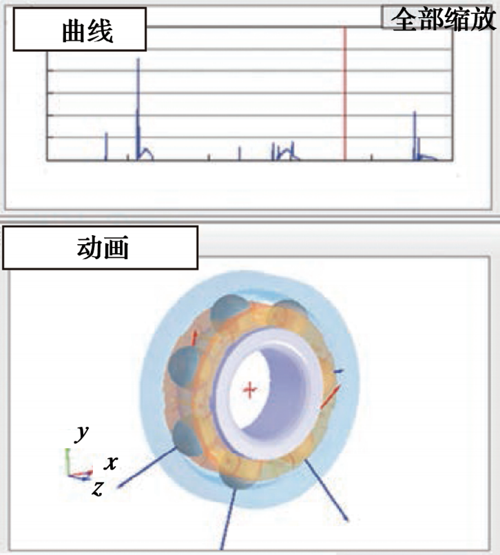 另外,對(duì)于零件間的接觸阻尼系數(shù),通過(guò)獨(dú)立的接觸阻尼試驗(yàn)和簡(jiǎn)化的數(shù)據(jù)輸入將各種材料、潤(rùn)滑油和潤(rùn)滑脂組合起來(lái),建立了數(shù)據(jù)庫(kù)。該系統(tǒng)支持樣本中列出的軸承類型,除更精確計(jì)算滾道圓度變形和邊緣接觸(圖5)外,還可分析通用軟件不容易分析的因素,如作為分析條件的各種軸承載荷和波動(dòng)、偏斜、激振和其他運(yùn)行條件。分析完成后,軸承性能以動(dòng)畫(huà)分析的形式直觀地出現(xiàn)在結(jié)果處理窗口上,還能以動(dòng)畫(huà)顯示沖擊載荷和摩擦作用的計(jì)算結(jié)果,為軸承設(shè)計(jì)提供數(shù)據(jù)支撐。S.S.A.P./MBD的結(jié)果處理窗口如圖6所示。