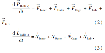 如(2)和(3)式所示,考慮了液體和潤(rùn)滑劑所產(chǎn)生的力和重力,如各零件的相互作用、滾動(dòng)黏滯阻力和混合阻力,并建立了各零件6自由度的平動(dòng)和旋轉(zhuǎn)運(yùn)動(dòng)方程。通過(guò)數(shù)值積分法求解由此建立的運(yùn)動(dòng)方程,得到下一步的狀態(tài)向量。從這點(diǎn)開(kāi)始,通過(guò)重復(fù)該循環(huán),可獲得各零件在每個(gè)時(shí)刻的狀態(tài)向量,并預(yù)測(cè)軸承性能。