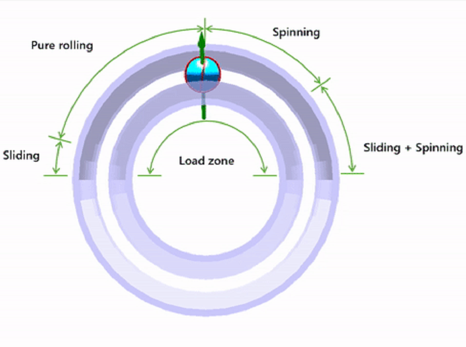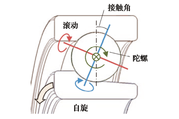 在此介紹的S.S.A.P./ MBD的首個(gè)使用示例是通過(guò)球軸承自旋分析進(jìn)行軸承內(nèi)部?jī)?yōu)化設(shè)計(jì)。如圖7所示,對(duì)于以某接觸角運(yùn)行的球軸承(例如軸向受載的角接觸球軸承和深溝球軸承),幾何上會(huì)產(chǎn)生球的自旋和陀螺旋轉(zhuǎn)。這就解釋了球與溝道之間的摩擦阻力是高速旋轉(zhuǎn)時(shí)球軸承摩擦力矩增加或溝道摩擦/卡死的原因。因此,要開(kāi)發(fā)高速且低摩擦力矩的球軸承,準(zhǔn)確掌握球的自旋特性非常重要。Jones模型是描述球軸承運(yùn)動(dòng)學(xué)的理論,假設(shè)球軸承在理想狀態(tài)下滑動(dòng)。由于在高速旋轉(zhuǎn)時(shí)存在不可忽略的陀螺運(yùn)動(dòng),計(jì)算結(jié)果會(huì)出現(xiàn)偏差。S.S.A.P./MBD是不受限制的3D動(dòng)力學(xué)分析軟件,能分析高速旋轉(zhuǎn)期間球與溝道之間的滑動(dòng),其中包括自旋和陀螺滑動(dòng)。