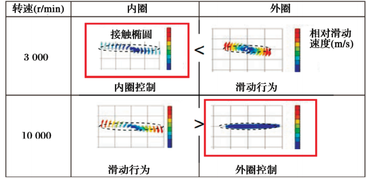 結(jié)果表明,對(duì)于內(nèi)圈旋轉(zhuǎn)的球軸承,在低速旋轉(zhuǎn)過(guò)程中由于球在外圈上的自旋和陀螺運(yùn)動(dòng)的作用,會(huì)產(chǎn)生相對(duì)滑動(dòng)速度,并且球與內(nèi)圈的相對(duì)滑動(dòng)速度低于球與外圈的相對(duì)滑動(dòng)速度。這表明在低速旋轉(zhuǎn)過(guò)程中,球由內(nèi)圈驅(qū)動(dòng),即內(nèi)圈控制。同時(shí),在高速旋轉(zhuǎn)時(shí)內(nèi)圈存在相對(duì)滑動(dòng)速度,球與外圈的相對(duì)滑動(dòng)速度更小,球的運(yùn)動(dòng)由外圈控制。這些分析趨勢(shì)被證實(shí)與實(shí)測(cè)和理論一致。此外,與傳統(tǒng)理論不同的一點(diǎn)是:在控制側(cè),接觸橢圓內(nèi)的相對(duì)滑動(dòng)速度甚至沒(méi)有完全消除,而是產(chǎn)生了較小的滑動(dòng)速度,因此可認(rèn)為成功分析了球自由運(yùn)動(dòng)。