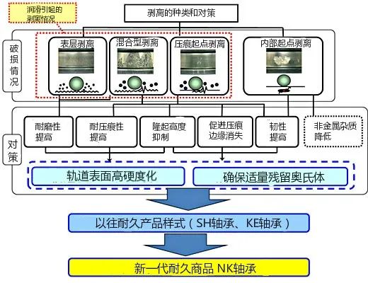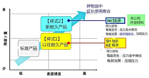 軸承的損傷分為內(nèi)部起點型剝離和表層型剝離,在農(nóng)用機械和建筑機械用軸承方面,除了應對內(nèi)部起點型剝離,異物油環(huán)境下針對以壓痕為起點的表層剝離,提高軸承耐久性成為有效的手段,具體方法如下: