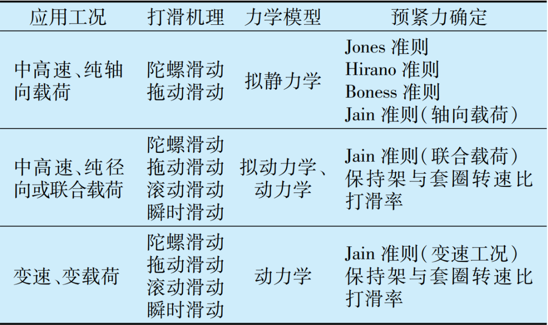 工程實際中預防軸承打滑最常用的方式是施加預緊力。對軸承施加合適的預緊力,一方面可防止軸承打滑,降低摩擦發(fā)熱和磨損,提高軸承使用壽命;另一方面,軸承預緊力影響轉(zhuǎn)子系統(tǒng)的支承剛度和固有頻率,從而影響軸承–轉(zhuǎn)子系統(tǒng)的動力學響應。針對不同應用工況,表1總結(jié)了以防止球軸承打滑為目標的最小預緊力的確定方法。