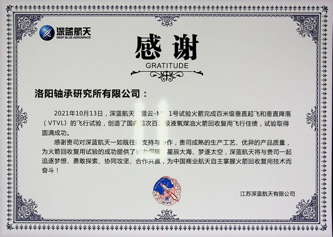 近日,洛陽(yáng)軸承研究所有限公司(以下簡(jiǎn)稱“軸研所”)收到江蘇深藍(lán)航天有限公司(以下簡(jiǎn)稱“深藍(lán)航天”)發(fā)來(lái)的感謝信,信中深藍(lán)航天對(duì)軸研所在“星云-M”1號(hào)試驗(yàn)箭成功完成百米級(jí)垂直起飛及降落(VTVL)飛行試驗(yàn)中提供的有力配套保障表示衷心感謝。