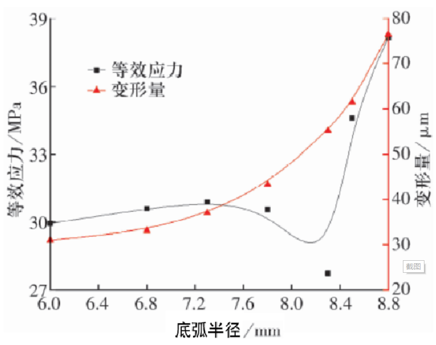 隨著底弧半徑的增大,保持架等效應(yīng)力呈先減小后增大的趨勢,變形量不斷增加。底弧的設(shè)計(jì)改變了保持架剛度,提高了保持架柔性,受載荷沖擊時(shí),產(chǎn)生較大變形,使保持架等效應(yīng)力減小。當(dāng)?shù)谆“霃竭^大時(shí),保持架柔性增大,但去除材料較多,導(dǎo)致相鄰結(jié)構(gòu)壁厚薄弱,保持架等效應(yīng)力增大。