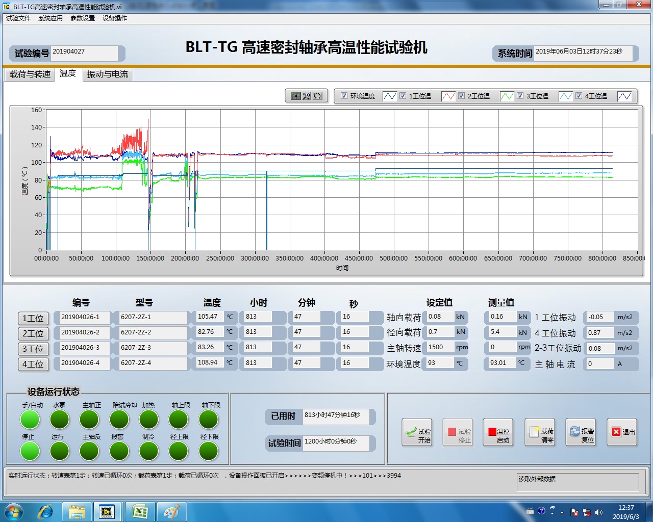 試驗(yàn)運(yùn)行情況如圖15所示,試驗(yàn)連續(xù)運(yùn)行時(shí)間為930h。對比試驗(yàn)的SKF同類型鐵蓋密封軸承僅運(yùn)行338h(如圖16)。