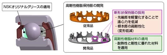 NSK通過新開發(fā)的潤滑脂和樹脂保持架,實(shí)現(xiàn)了dm·n值140萬的高速旋轉(zhuǎn)工況(軸承內(nèi)徑:35 mm;轉(zhuǎn)速:30000r/min),如圖3所示;今年NSK又推出了第三代世界最高轉(zhuǎn)速、電動(dòng)車驅(qū)動(dòng)電機(jī)用高速球軸承(圖4)。