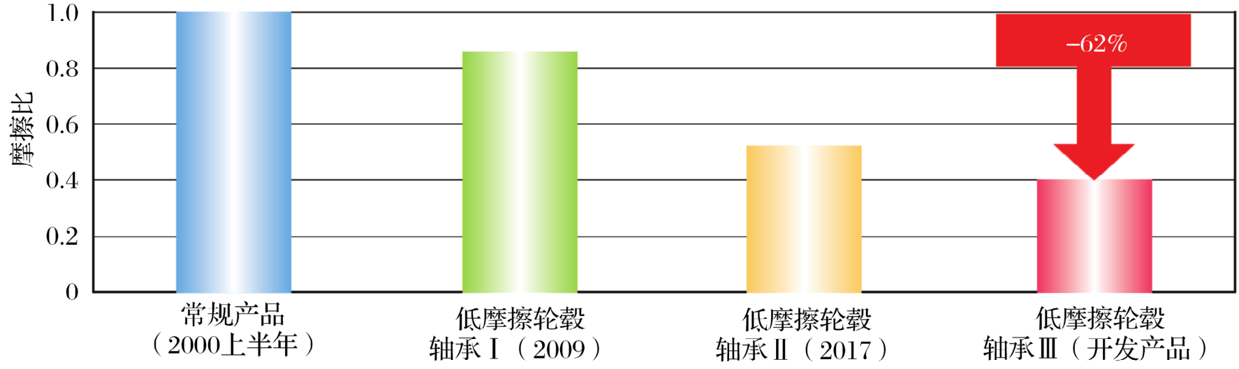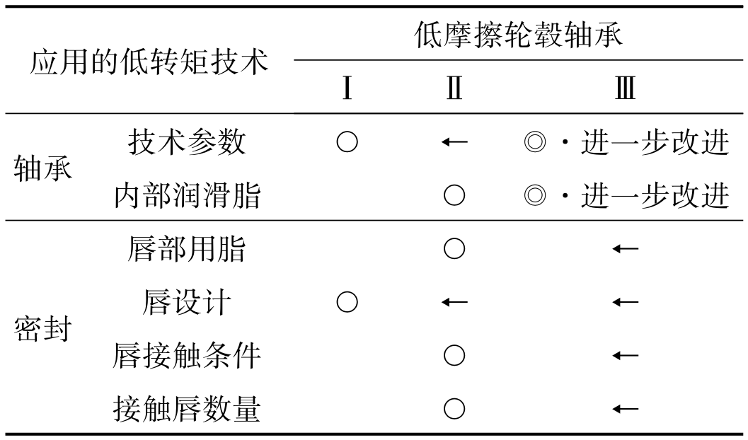 為減小轉(zhuǎn)矩,NTN的輪轂軸承已演變?yōu)榈湍Σ凛嗇炤S承Ⅰ,Ⅱ和Ⅲ。演變概況見表1,相對于常規(guī)產(chǎn)品的轉(zhuǎn)矩減小比如圖3所示。