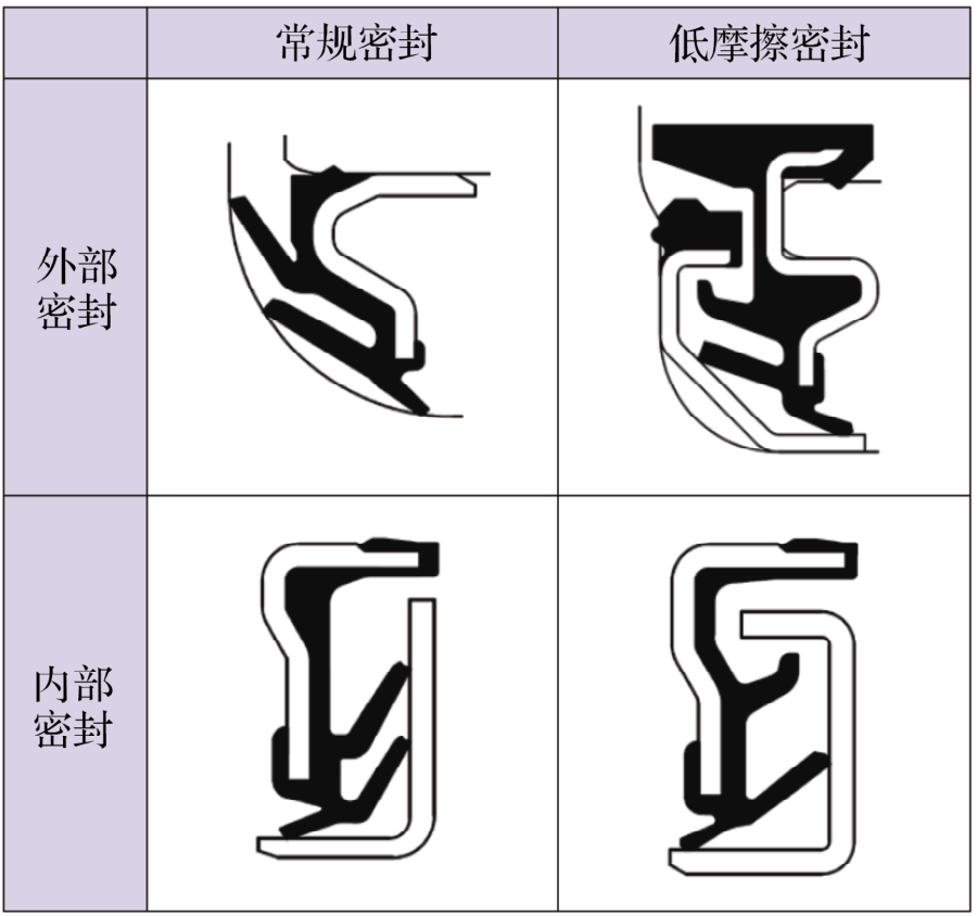 第3代輪轂軸承常規(guī)密封和低摩擦密封采用的外部密封和內(nèi)部密封的結(jié)構(gòu)對比如圖6所示。