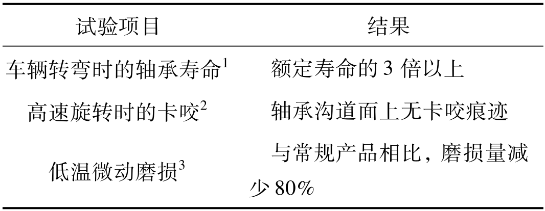 還進(jìn)行了可靠性評價(jià)試驗(yàn),以驗(yàn)證所需的功能,見表3。填充新潤滑脂的軸承滿足了試驗(yàn)項(xiàng)目的所有開發(fā)目標(biāo),實(shí)現(xiàn)了軸承內(nèi)部潤滑脂所要求的所有功能。