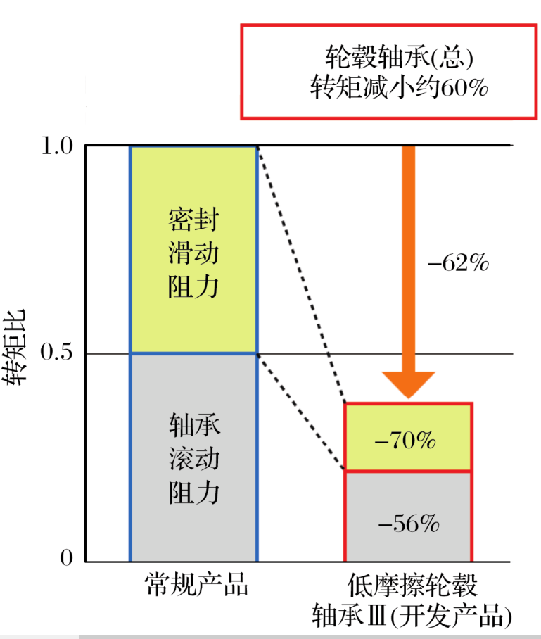 與常規(guī)產(chǎn)品相比,新開發(fā)的低摩擦輪轂軸承Ⅲ的轉(zhuǎn)矩減小了62%。通過應(yīng)用之前開發(fā)的技術(shù)參數(shù)和新開發(fā)的潤滑脂(改進(jìn)了低摩擦輪轂軸承Ⅱ的內(nèi)部潤滑脂)來實(shí)現(xiàn)轉(zhuǎn)矩的減小。