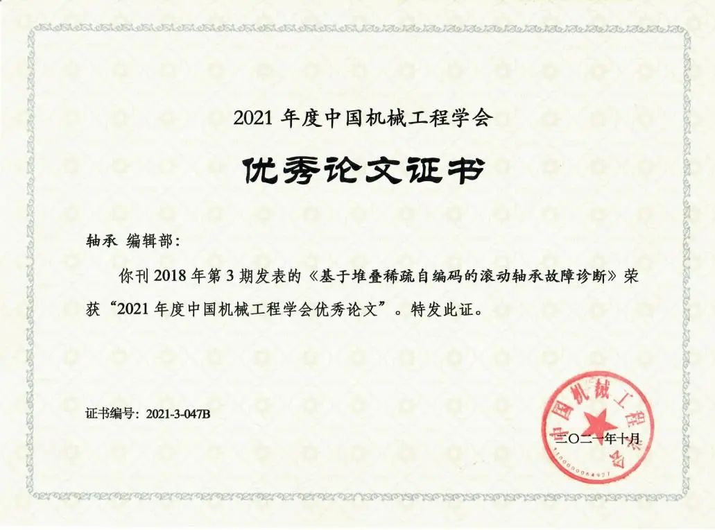 喜報:《軸承》發(fā)表文章榮獲“2021年度中國機械工程學(xué)會優(yōu)秀論文”