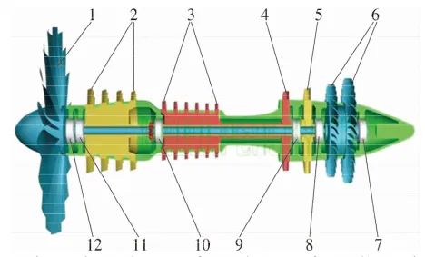 1-風扇;2-中壓壓氣機;3-高壓壓氣機;4-高壓渦輪;5-中壓渦輪;6-低壓渦輪;7,12-低壓軸承;8,11-中壓軸承;9,10一高壓軸承。
