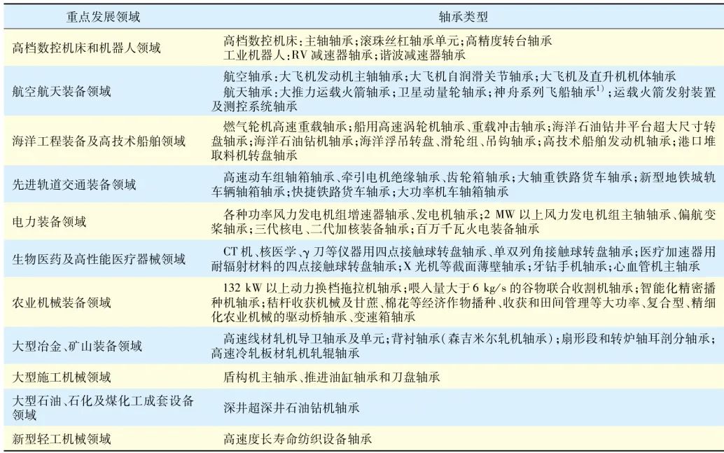 我國戰(zhàn)略性新興產(chǎn)業(yè)和制造強國戰(zhàn)略重點發(fā)展領(lǐng)域需要大量的高端軸承為重大技術(shù)裝備配套,軸承行業(yè)應著力進行這些軸承的研發(fā)→工程化→產(chǎn)業(yè)化,“十四五”期間我國重大技術(shù)裝備配套軸承的開發(fā)任務涉及到的具體領(lǐng)域及軸承類型見表1。