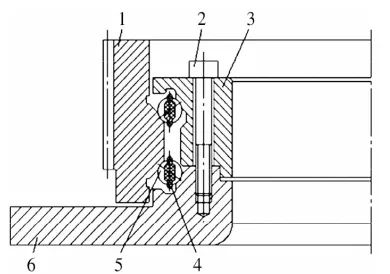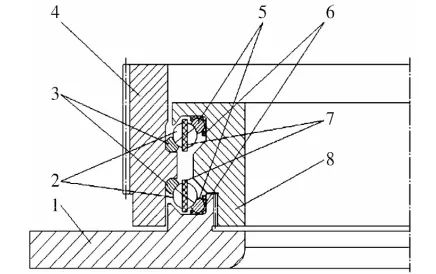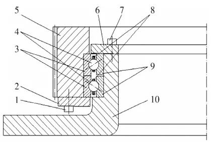 1—外圈壓板螺釘;2—外圈壓板;3—外圈;4—鋼球;5—軸承座;6—內圈壓板;7—內圈壓板螺釘;8—保持架;9—內圈;10—CT機主軸。