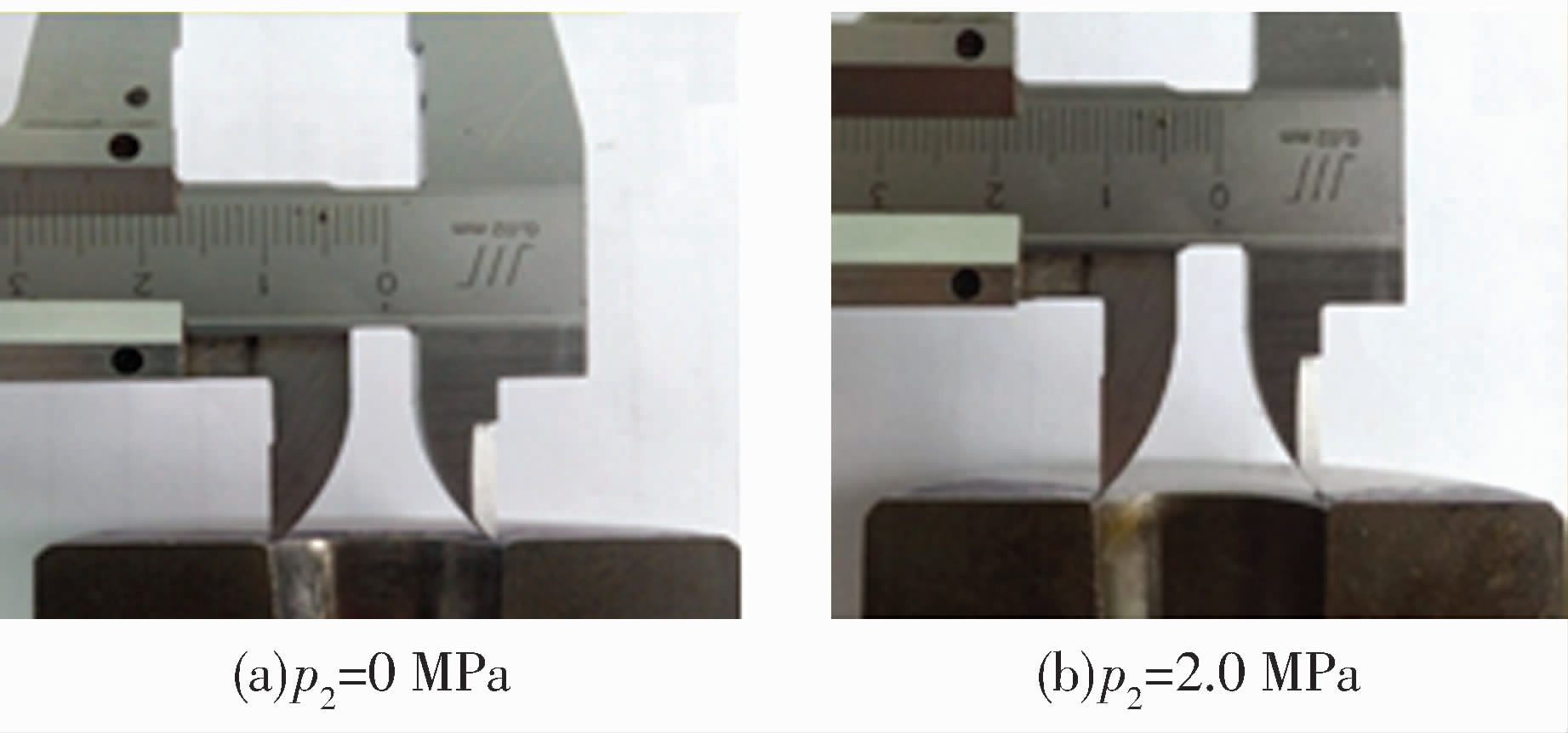 在上述無背壓的“穿膛過”磨粒流加工條件下,將加工后的工件線切割開,可以明顯看出進出口處的尺寸d1,大于中間區(qū)域的尺寸d0,并形成“喇叭口”。出現(xiàn)該結果的主要原因是由于黏彈性磨料在出口處的突然擠入與釋放時形成的擠壓壓力過大,從而在工件兩端出現(xiàn)嚴重的過拋現(xiàn)象,嚴重影響空心滾子的尺寸。為避免“喇叭口”的形成,應該控制進出口的壓差,使磨粒流在加工過程中實現(xiàn)均勻的擠壓運動。因此,在擠壓過程中對磨粒流施加一個回程壓力,即背壓P2與“穿膛過”式(背壓P2為零)的情況相比,在擠壓過程中增加磨料流回程壓力,可以降低壓力在進出口處的突變,實現(xiàn)進出口處壓力的小壓差調(diào)節(jié),從而有效抑制“喇叭口”的形成,其原理如圖6所示。