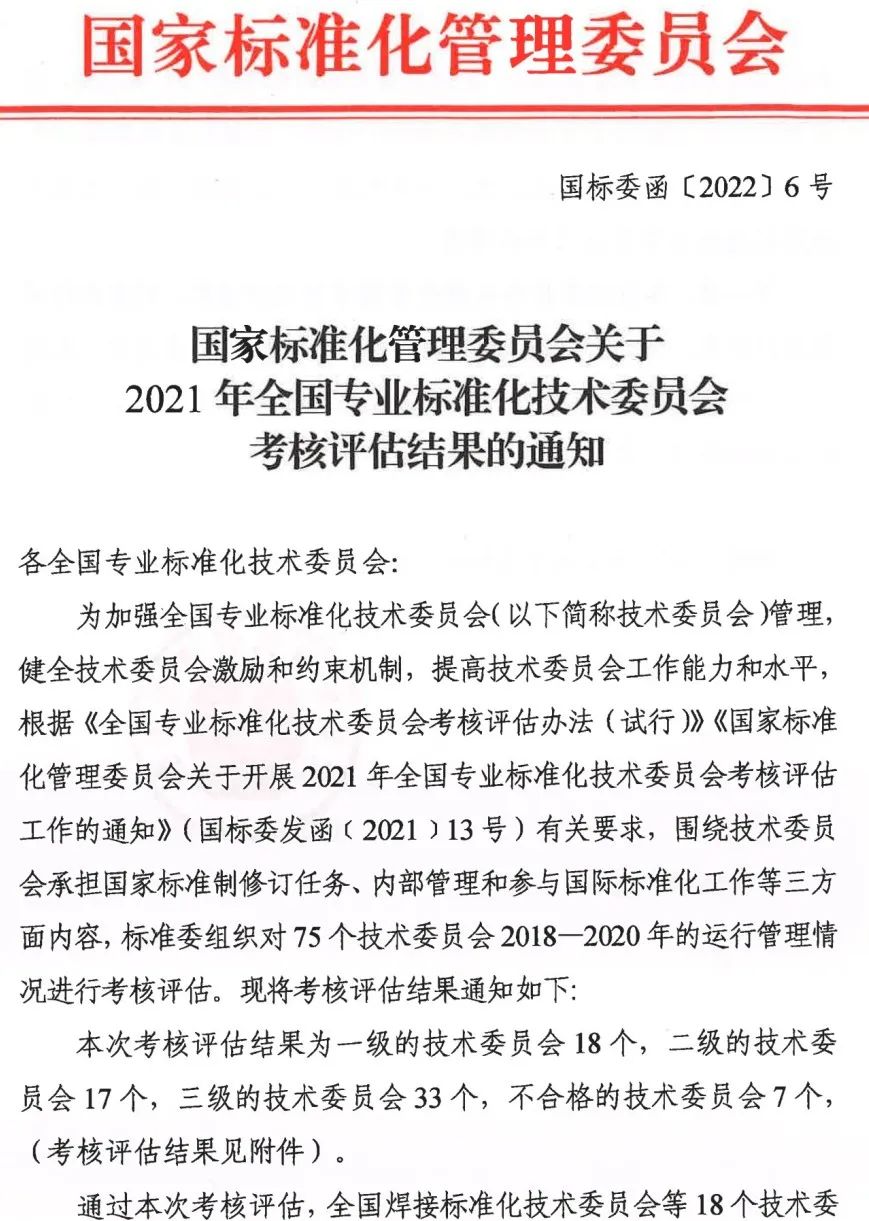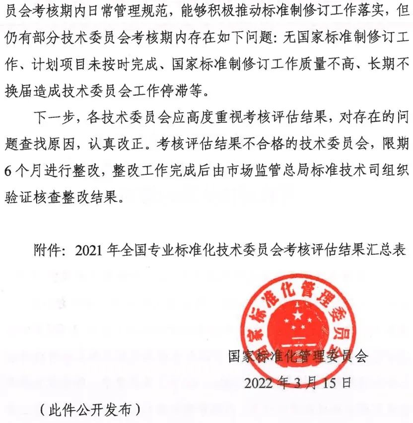 為加強全國專業(yè)標準化技術(shù)委員會(以下簡稱標委會)管理,健全標委會激勵和約束機制,提高標委會工作能力和水平,國家標準委根據(jù)《全國專業(yè)標準化技術(shù)委員會考核評估辦法(試行)》《國家標準化管理委員會關(guān)于開展2021年全國專業(yè)標準化技術(shù)委員會考核評估工作的通知》的有關(guān)要求,圍繞標委會承擔的國家標準制修訂任務(wù)、內(nèi)部管理和參與國際標準化工作等三方面內(nèi)容,對75個標委會2018-2020年的運行管理情況進行考核評估,并于2022年5月20日公布了此次考核評估結(jié)果(國標委函〔2022〕6號):全國滾動軸承標準化技術(shù)委員會等18個標委會的考核評估結(jié)果為一級。此外,考評結(jié)果為二級的標委會17個,三級標委會33個,不合格標委會7個。