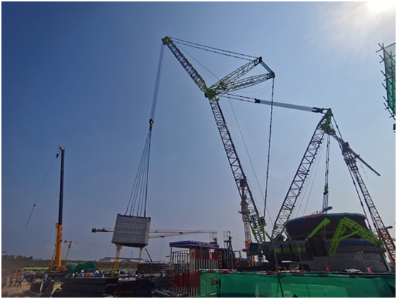 海南昌江“華龍一號”3號機組非能動注水箱模塊一的吊裝總重量約為122噸,在歷時2小時的起升、帶載行走、回轉、變幅、落鉤等作業(yè)后,設備精準就位,吊裝過程中,起重機運行平穩(wěn)正常、安全、可控。此次吊裝采用中聯重科2000噸履帶式起重機,其專用的六排滾子回轉支承由公司自主研發(fā)、生產制造。
