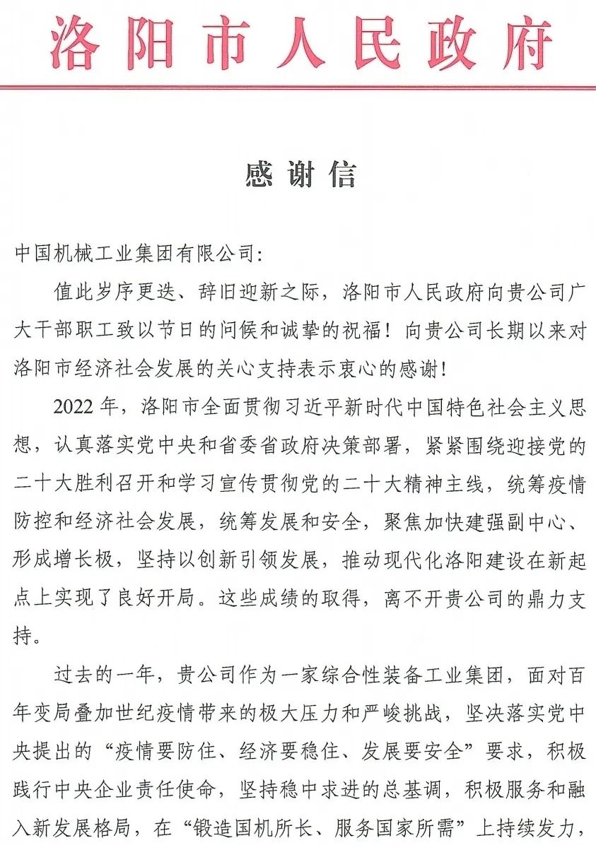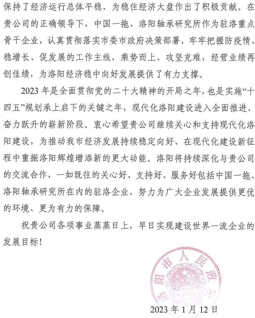 1月12日,國機(jī)集團(tuán)收到洛陽市人民政府發(fā)來的感謝信,信中充分肯定了軸研所面對世紀(jì)疫情帶來的巨大沖擊,迎難而上,勠力同心,再創(chuàng)佳績,為洛陽經(jīng)濟(jì)穩(wěn)中向好發(fā)展提供了有力支撐。