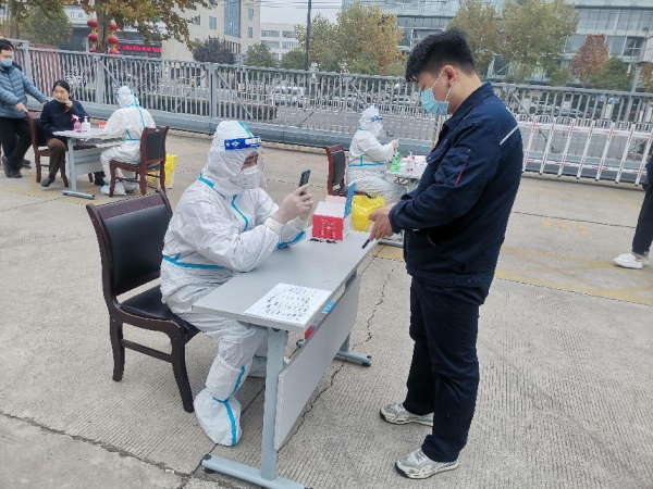 第二次閉環(huán)管理期間,駐廠員工中發(fā)現(xiàn)疑似病例,為進(jìn)一步降低交叉感染的風(fēng)險(xiǎn),核酸檢測(cè)點(diǎn)由3個(gè)縮減為1個(gè),面對(duì)繁重的核酸檢測(cè)任務(wù),王智勇最長(zhǎng)5個(gè)小時(shí)沒(méi)有喝水、沒(méi)有上廁所,用一切辦法與時(shí)間賽跑、同病毒戰(zhàn)斗。