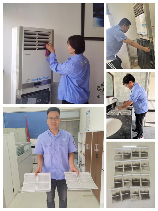 在活動現(xiàn)場,志愿者們分工明確,配合密切,拆卸空調外殼、清洗空調濾網、擦拭空調外機,經過一下午有條不紊的清洗活動,辦公室和會議室的空調從內到外煥然一新?!皼]想到空調濾網這么臟”“太好了,終于能放心開空調了”,看著沖洗出的灰塵污漬,員工們對志愿者助人為樂、無私奉獻的精神紛紛表示感謝和贊揚。