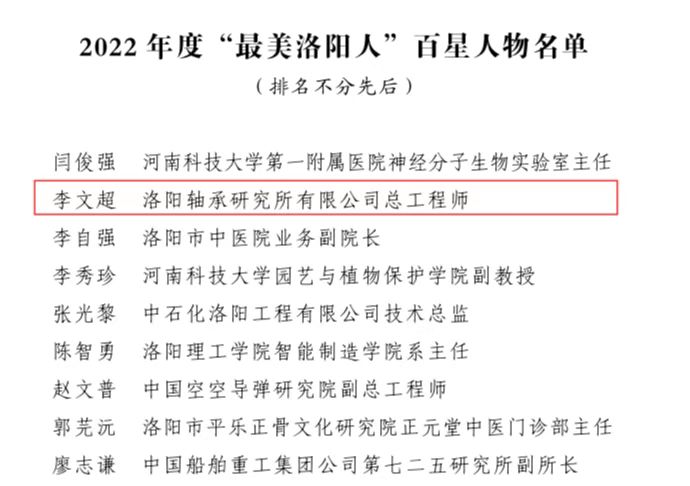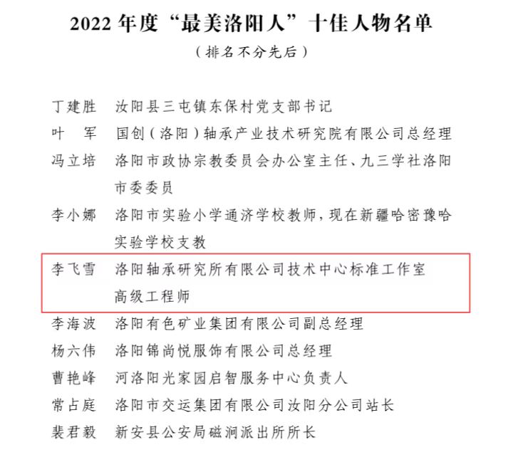 近日,洛陽市委宣傳部發(fā)布《關(guān)于表揚2022年度“最美洛陽人”十佳百星人物的決定》,公司技術(shù)中心標(biāo)準(zhǔn)工作室李飛雪當(dāng)選“最美洛陽人”十佳人物,公司副總經(jīng)理、總工程師李文超當(dāng)選“最美洛陽人”百星人物。