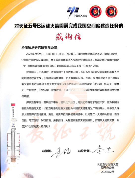 近日,軸研所收到長(zhǎng)征五號(hào)運(yùn)載火箭型號(hào)辦公室發(fā)來(lái)的感謝信,信中對(duì)軸研所為我國(guó)空間站建造過(guò)程中所做出的重要貢獻(xiàn)表達(dá)了衷心的感謝和崇高的敬意。