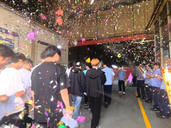 “嘭!嘭!嘭!”禮花筒錯落響起,“歡迎!歡迎!熱烈歡迎”在精密部件事業(yè)部主軸部副部長何靈輝的帶領(lǐng)下,伴隨著漫天飄舞的彩帶,和熱烈的歡呼聲,新員工們踏入了主軸制造部。